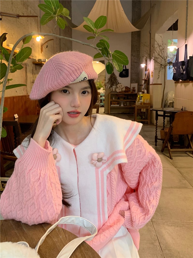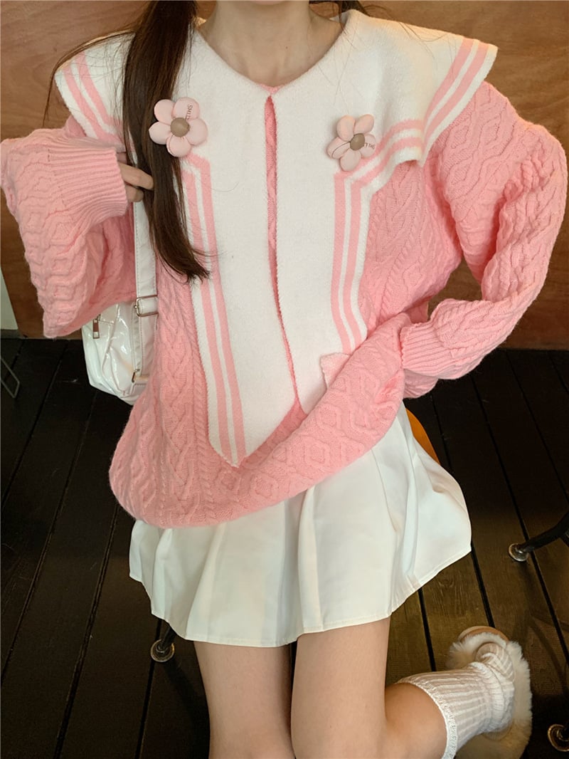 Pink Navy Collar Knitted Sweater With Flower Detail