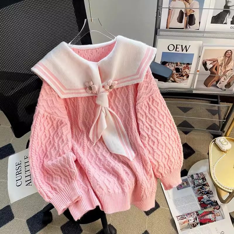 Channel your inner springtime with our charming pink knitted sweater! This cozy pullover features a contrasting navy collar for a preppy touch, and delicate flowers add a whimsical flourish. Perfect for layering on chilly days, this sweater is sure to become a favorite in your wardrobe.