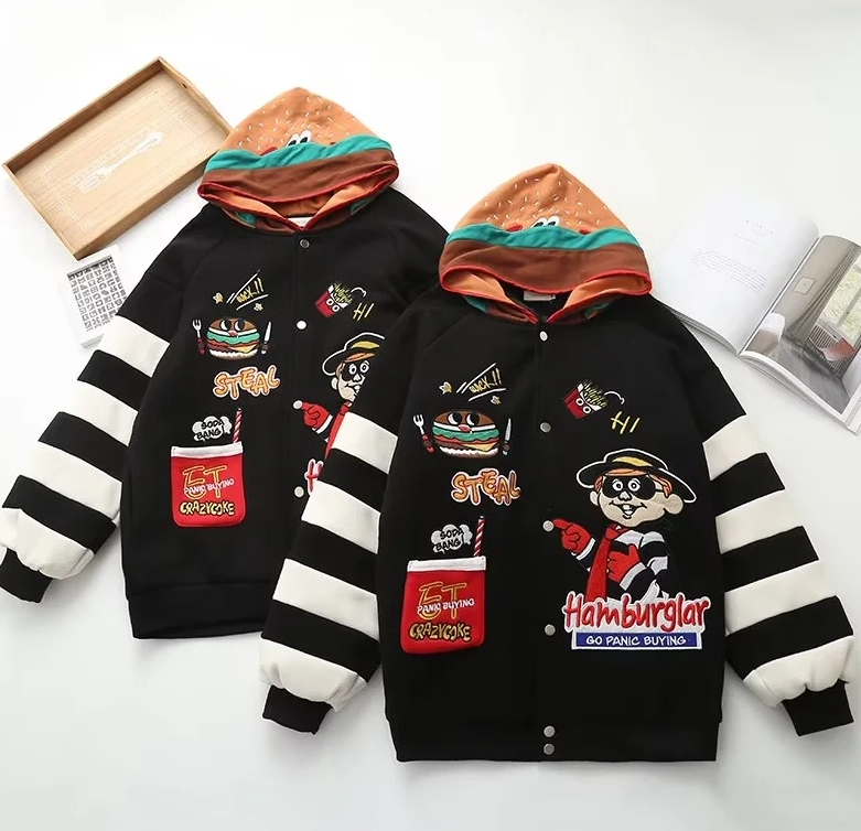 Turn heads with the Harajuku Hamburger Embroidered Bomber Jacket — a bold fusion of street art and comfort. Featuring a playful hamburger cartoon embroidery on the front and graffiti-inspired detailing throughout, this jacket brings Tokyo street style to life. The striped sleeves add a sporty punch, while the cotton blend fabric keeps it soft, breathable, and ready for daily wear. Whether you’re layering it over a tee or rocking it as a statement piece, this bomber delivers attitude with a side of fun. Perfect for anyone who loves standout fashion with personality and edge.