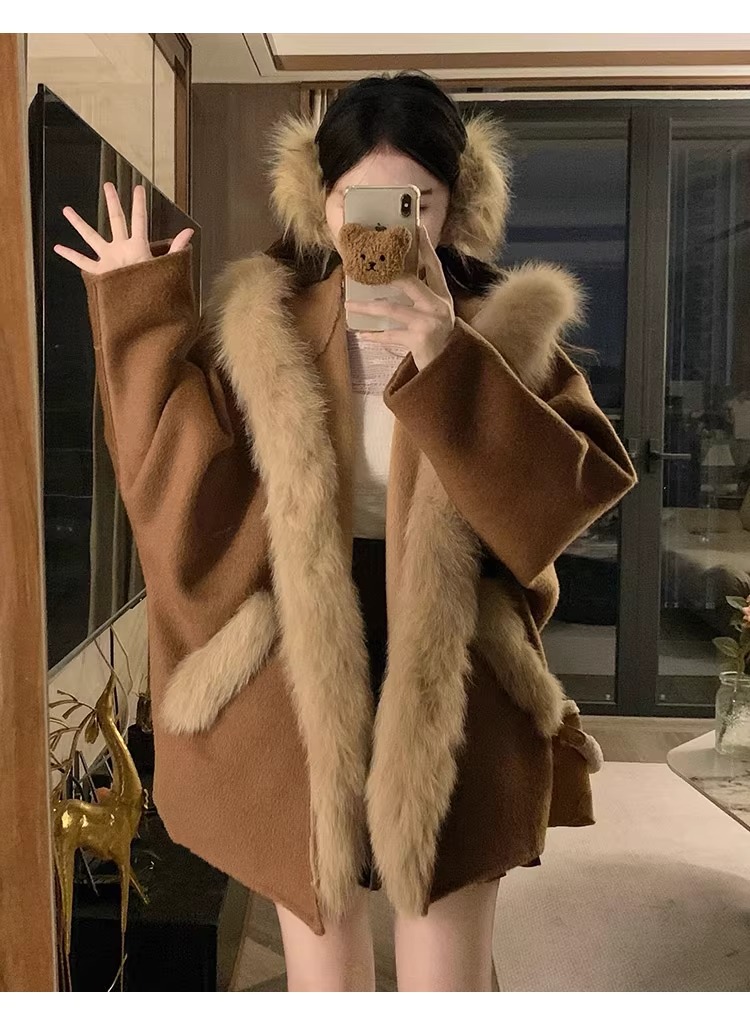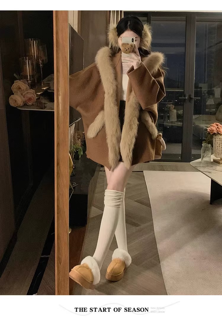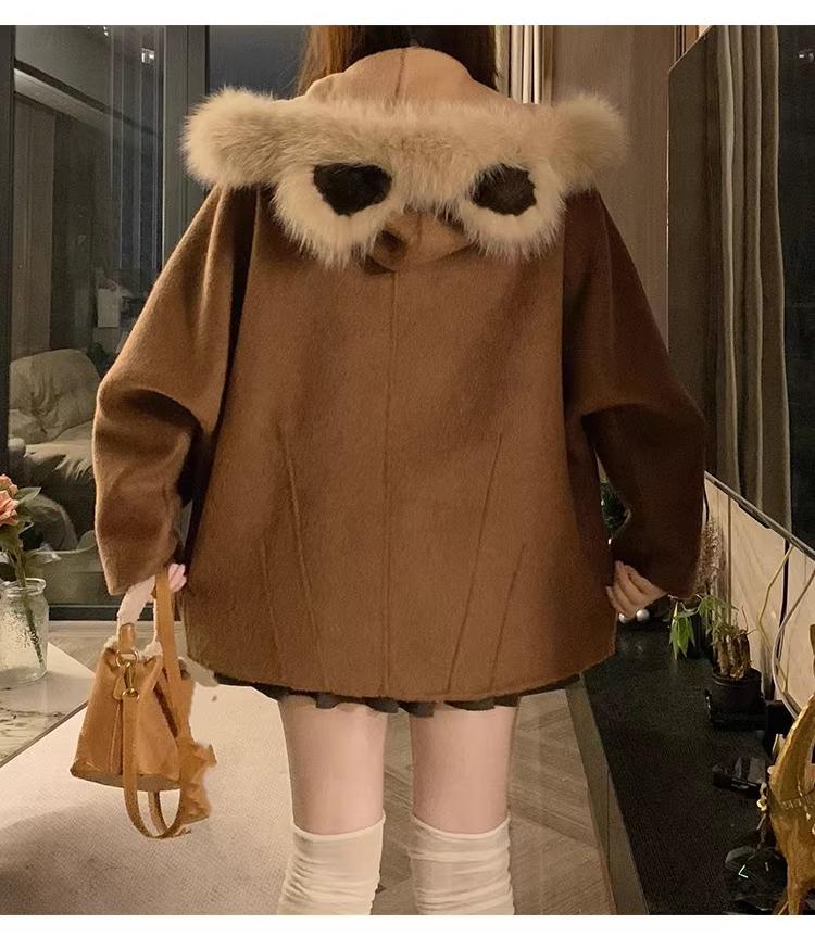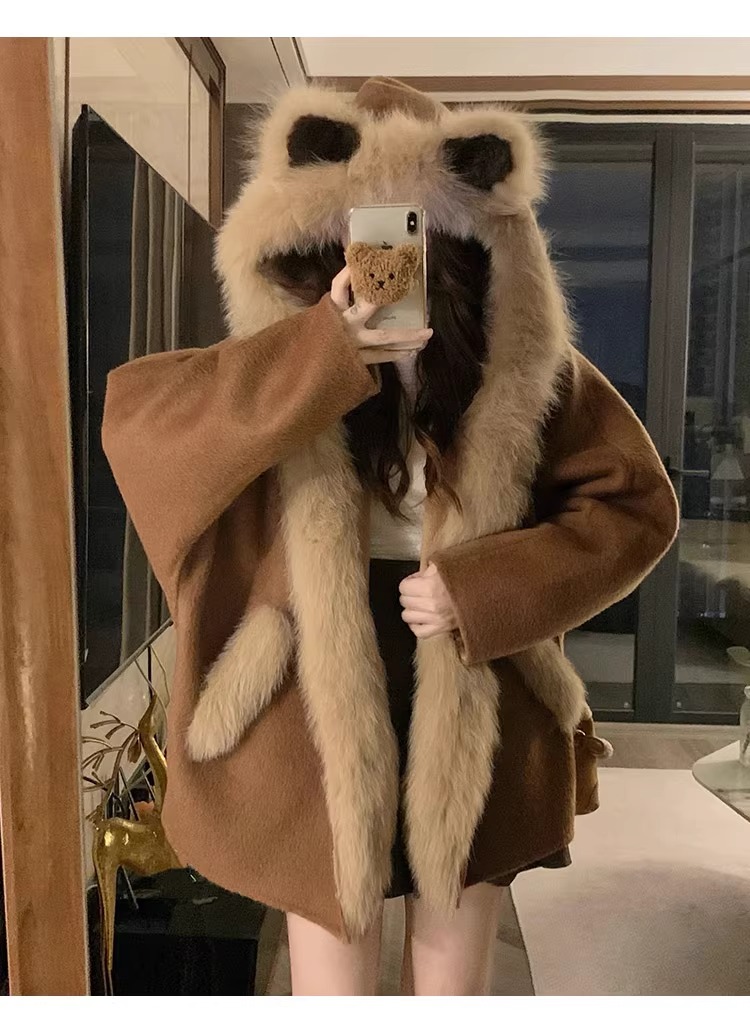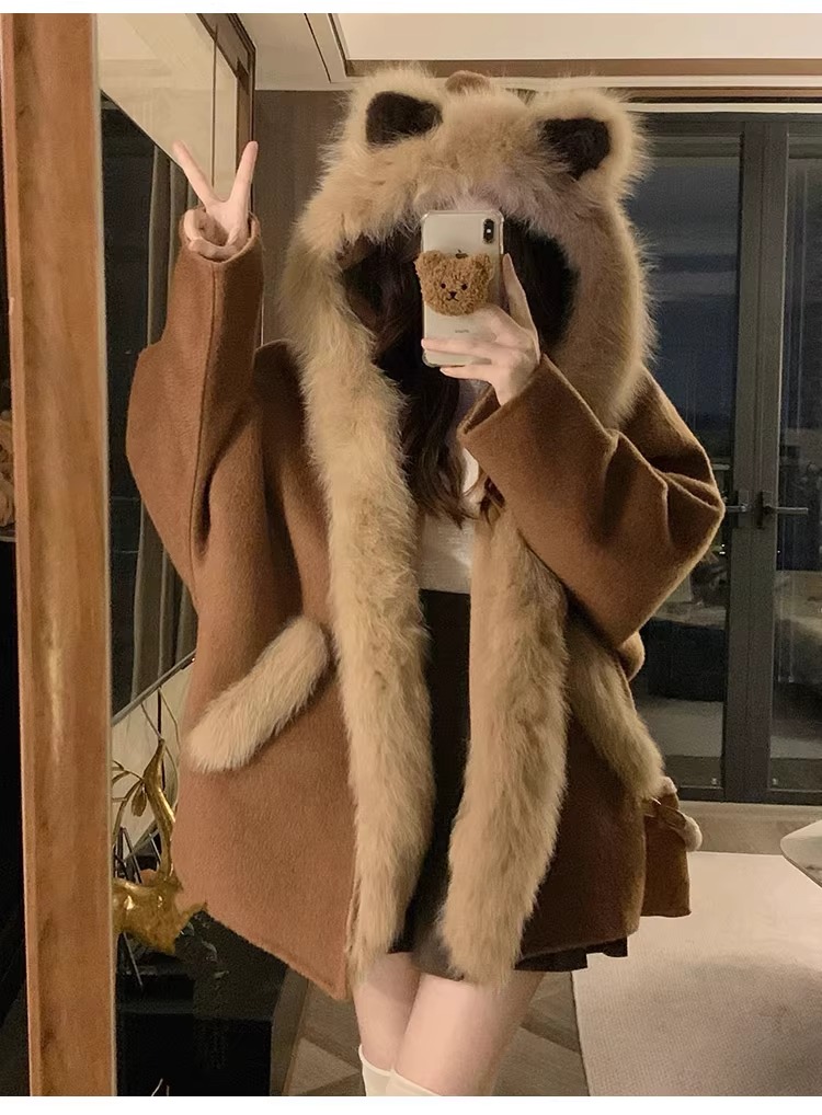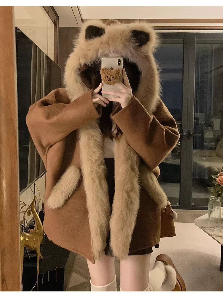 Wrap yourself in the ultimate snuggle with the Mocha Pine Cone Woolen Hoodie Coat! This ridiculously soft coat features an adorable design with cute ears on the hood and a luxurious, soft fur edge trim. The rich, warm mocha color is stylish and versatile. Made from cozy woolen material, it's perfect for keeping warm while adding a touch of playful charm to your cold-weather look. Get ready for compliments!