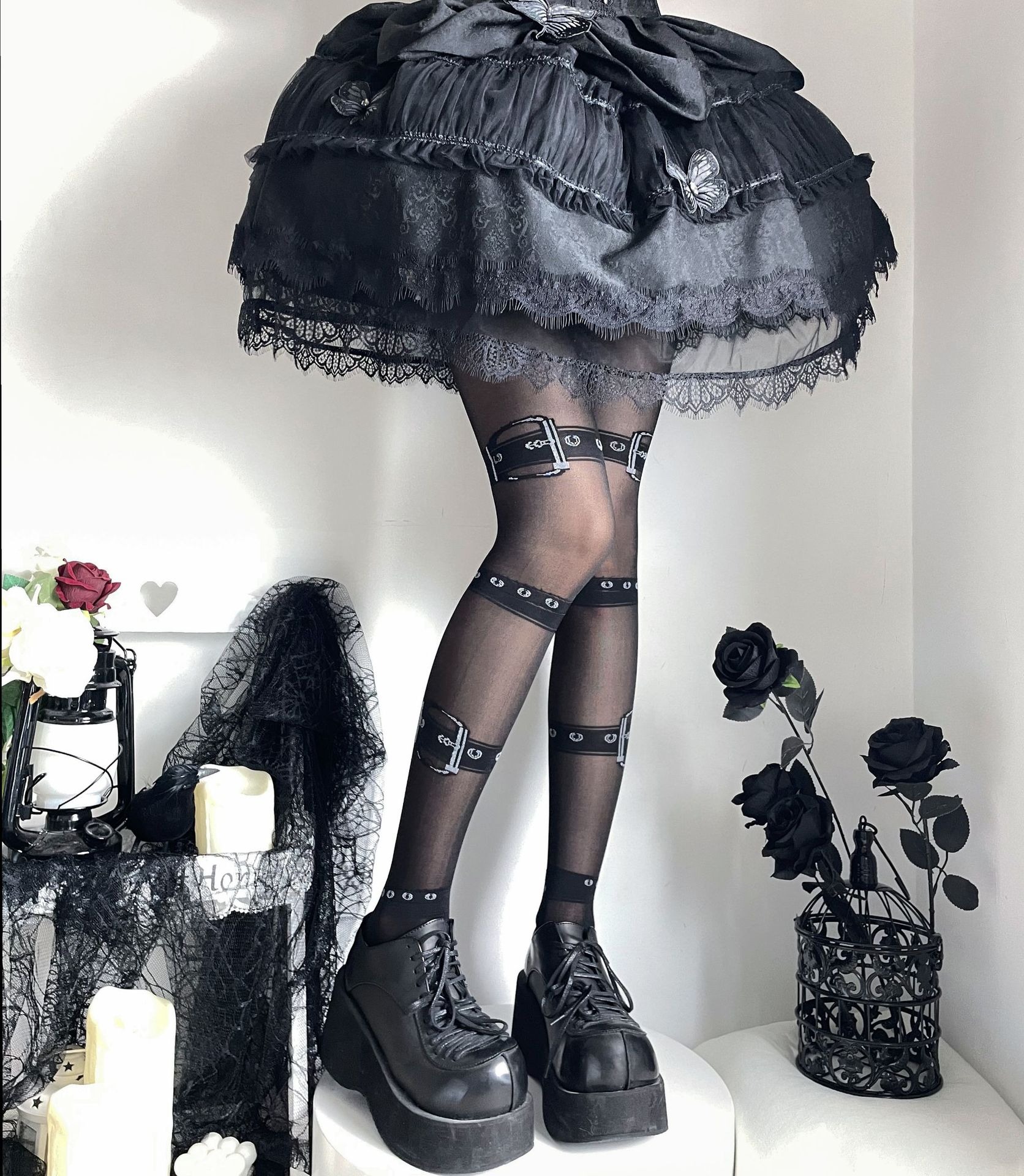 These unique pantyhose feature a bold, intricate tattoo-inspired design that runs down the leg, complemented by a stylish buckle detail at the thigh. Made from a durable yet stretchy material, they provide a comfortable fit while making a powerful fashion statement. Perfect for adding an instant dose of attitude to any outfit, these tights are a must-have for those who dare to be different.