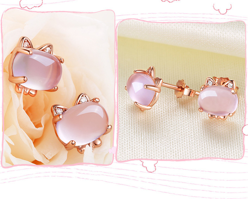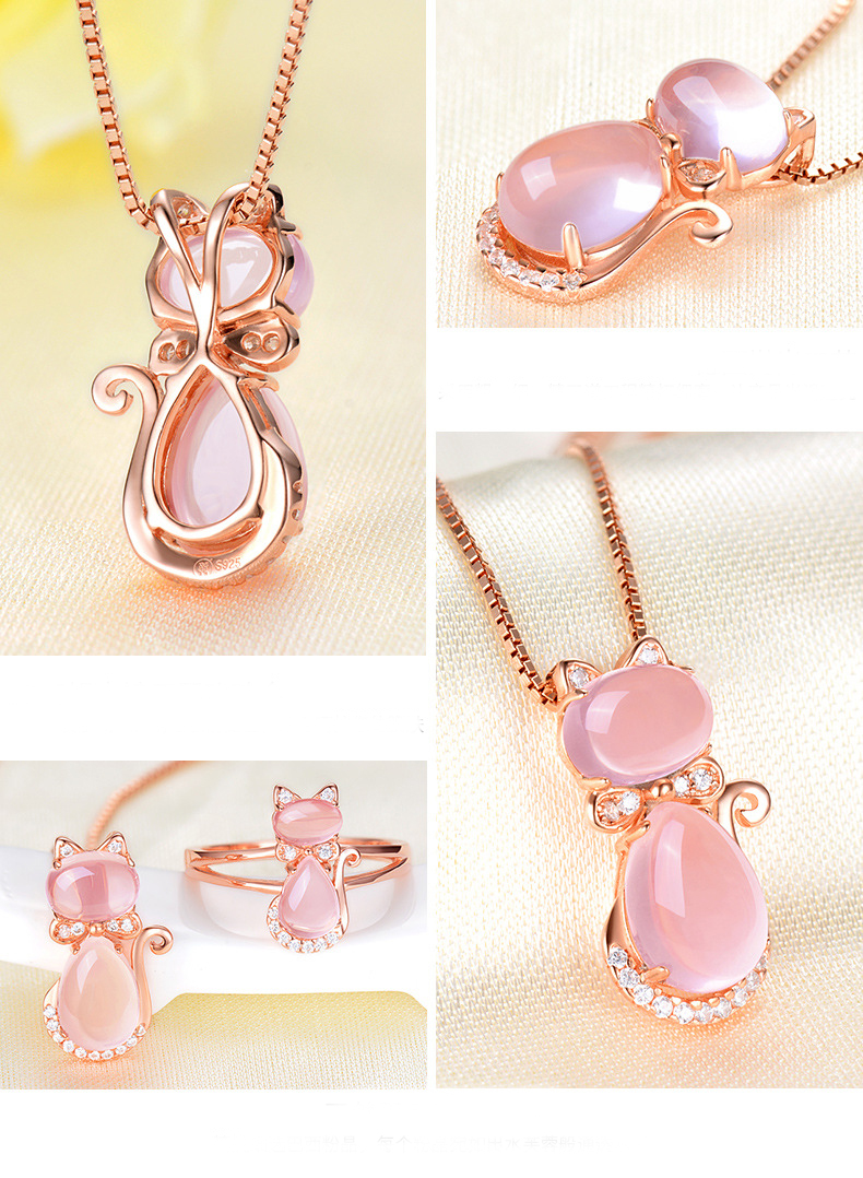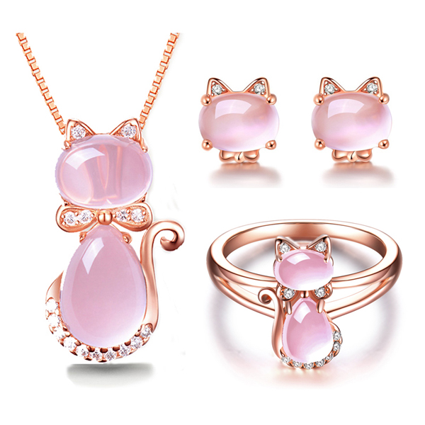 Cute Cat Crystal Quartz Pink Opal Necklace Earrings Ring Set
