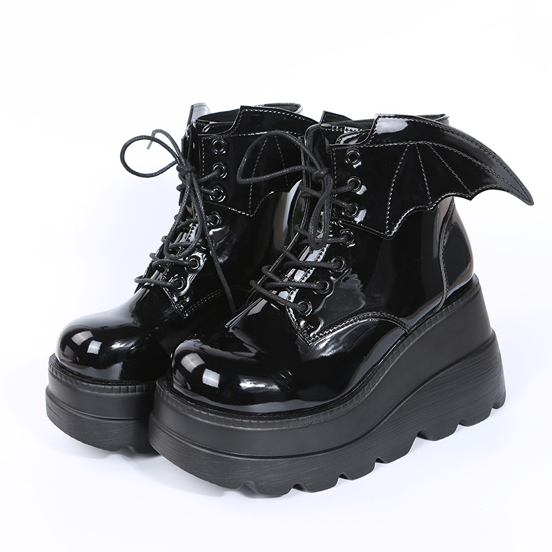 Black Wedge Heeled Platform Ankle Boots With Wings