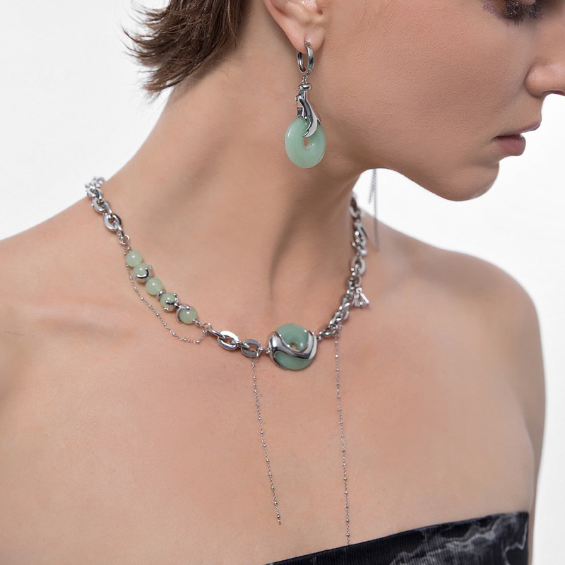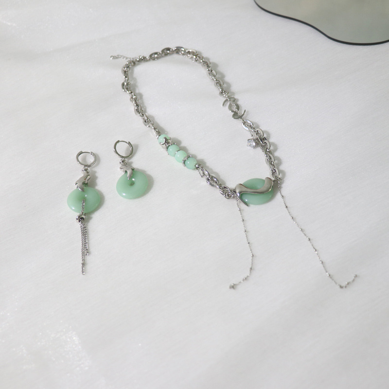 Chinese Style Asymmetric Jade Tassel Necklace Earrings Set
