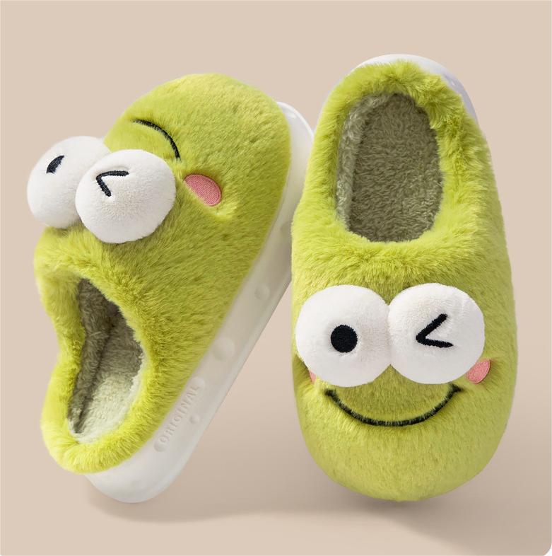 The slippers feature a cute and playful frog design with funny eyes and a sweet smile. The frog's big, bright eyes and wide smile are sure to bring a smile to your face every time you see them.