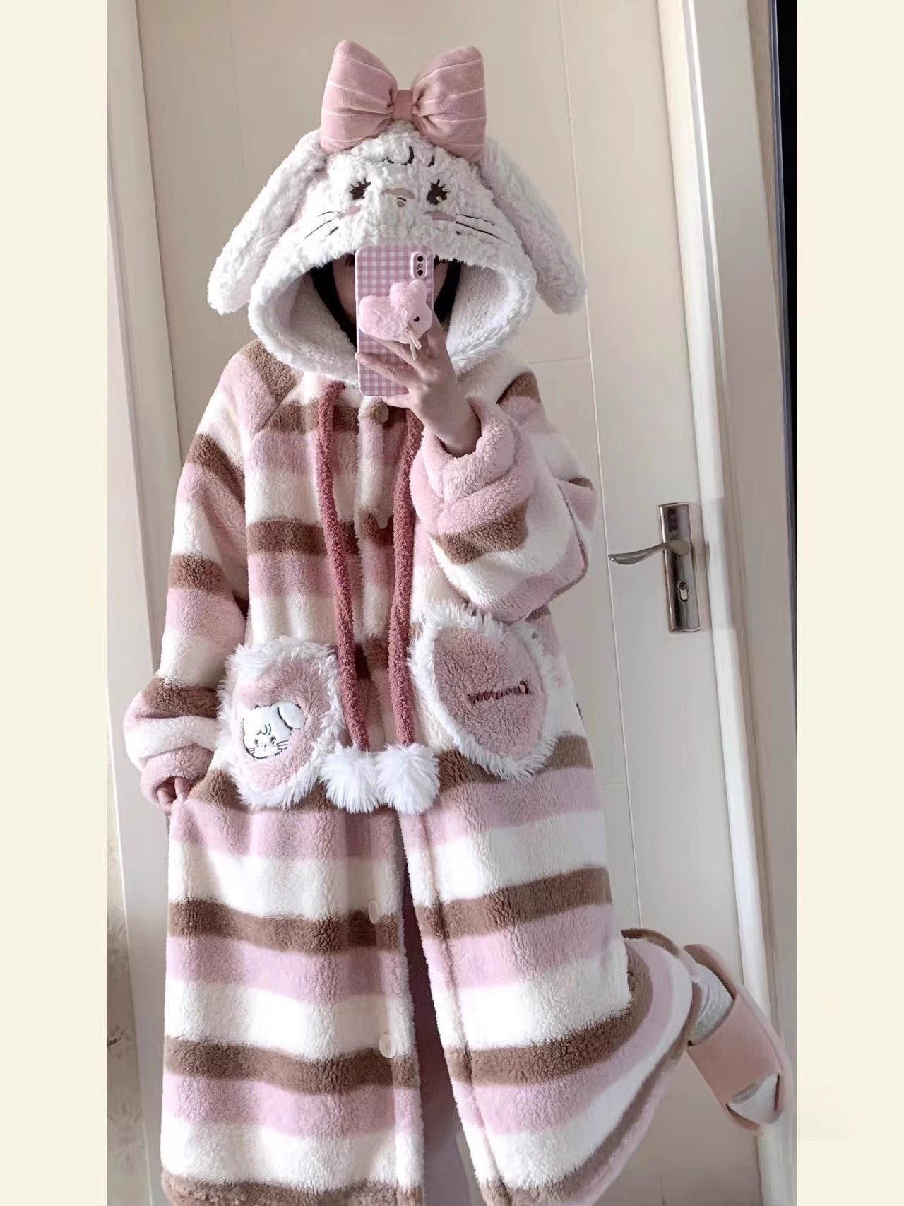 Cute Bunny Ear Striped Hoodie Flannel Nightgown Nightwear
