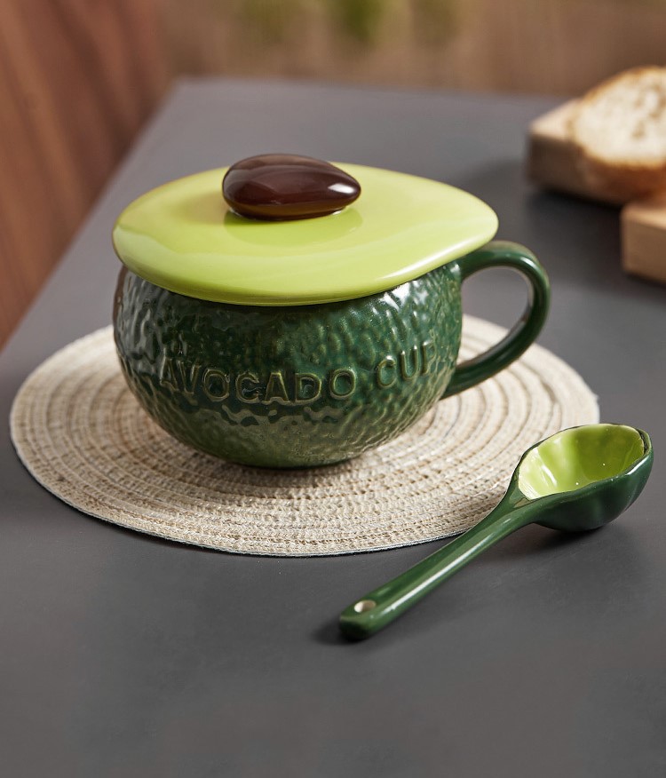 Material: Ceramic; Capacity: 300 ml; Set: 1 mugs + 1 lid + 1 spoon