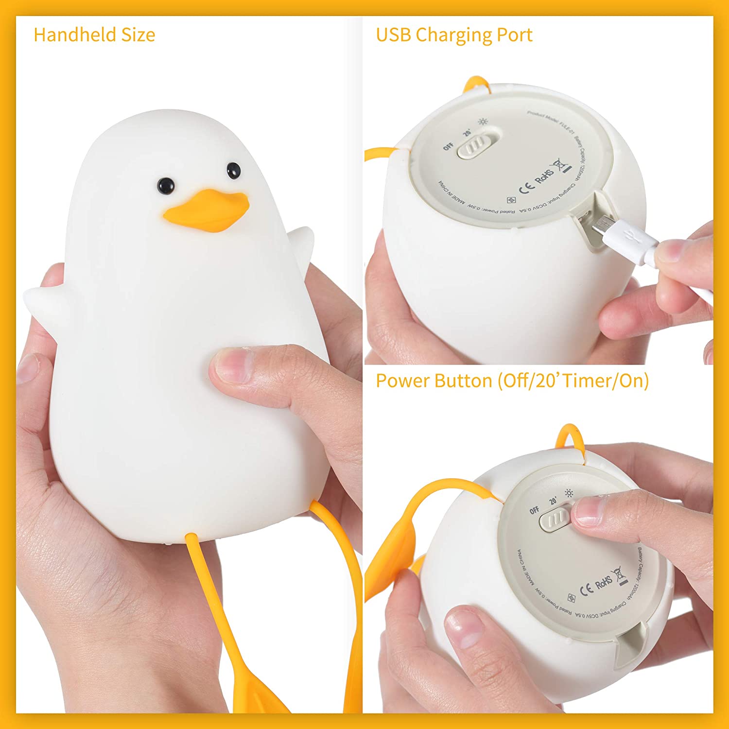 【Fun duck night light】: With cute duck shape and warm light, it is easier for children to fall asleep while playing. You can click the top to adjust the brightness of the night light in the weak, medium and strong gears, and finally turn it off.