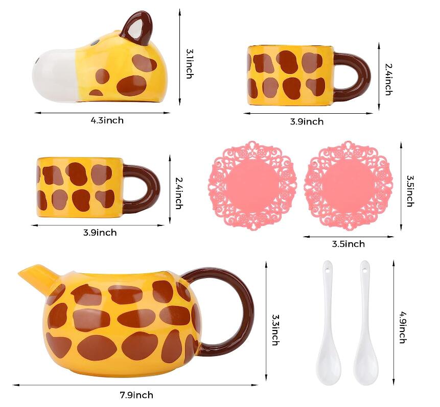 We're sure your new friends will enjoy chatting with you while sipping on your favorite beverage with our Giraffe Pot And Mug Set. This set includes a pot, two mugs, and a lid. If you stack them up, you'll get a cute giraffe. It also comes with a white spoon. It'll add a touch of fun to your table.