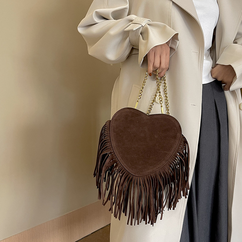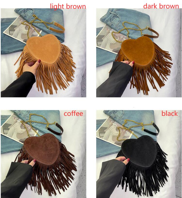 Introducing our Heart Shape Tassel Bag, the epitome of chic charm. Crafted from luxe suede leather, this bag is a tactile delight. The heart shape adds a romantic touch, while the playful tassel detailing exudes whimsy. The chain strap lends a hint of edge, striking a perfect balance between sweet and bold. Available in four gorgeous colors, this bag is not just an accessory; it's a statement. Elevate your style and express your personality with this versatile and eye-catching heart-shaped beauty.