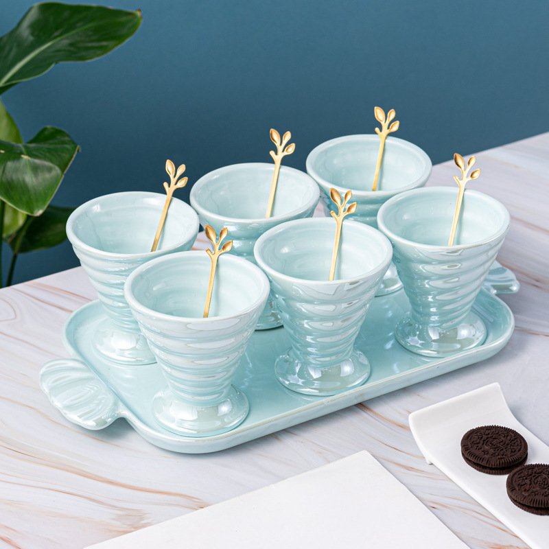 Indulge in elegance with our 13pcs Glaze Ceramic Thread Ice Cream Dessert Salad Cup Set. This exquisite collection includes 6 mugs, 6 spoons, and a stylish tray, perfect for serving up delectable treats with sophistication. Crafted with glazed ceramic and adorned with intricate thread detailing, each piece adds a touch of luxury to any table setting. Elevate your dining experience and impress your guests with our stunning Glaze Ceramic Thread Ice Cream Dessert Salad Cup Set – where every serving becomes an occasion to savor.