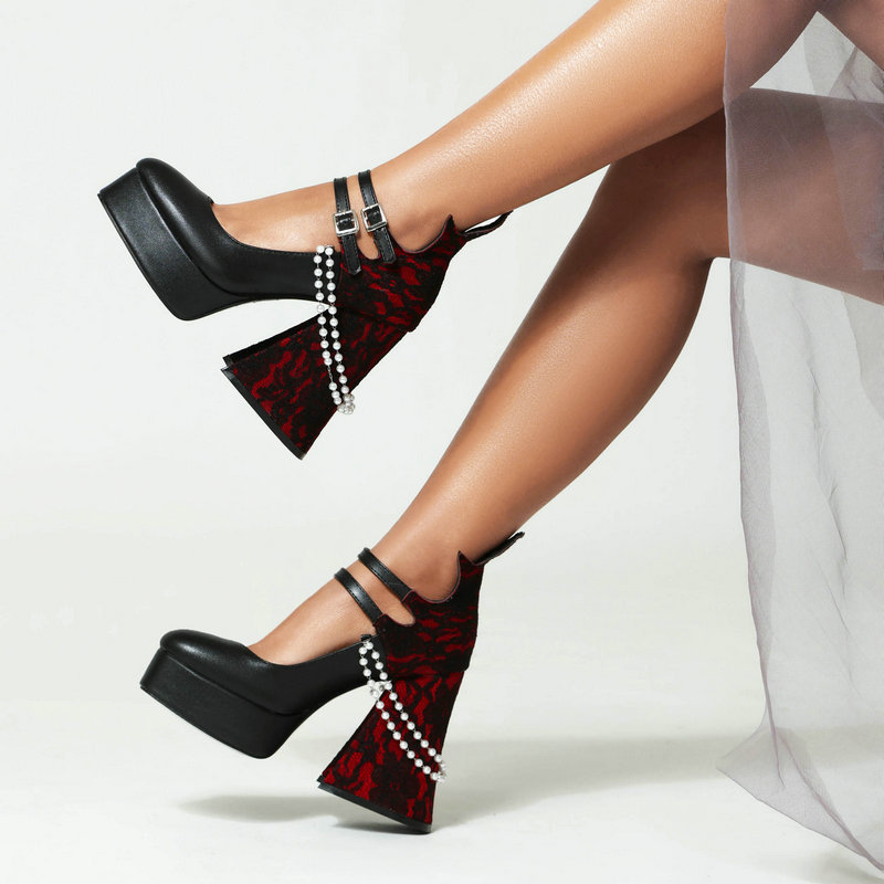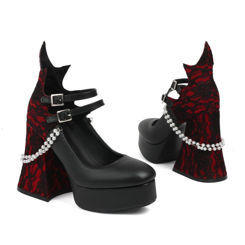 Unleash your dark side with our Gothic Lace Splicing Pearl Chain Pumps! These beauties fuse delicate lace with a chunky pearl chain for a unique and edgy look. Walk tall with confidence and a touch of elegance. Perfect for adding a touch of drama to your outfit.