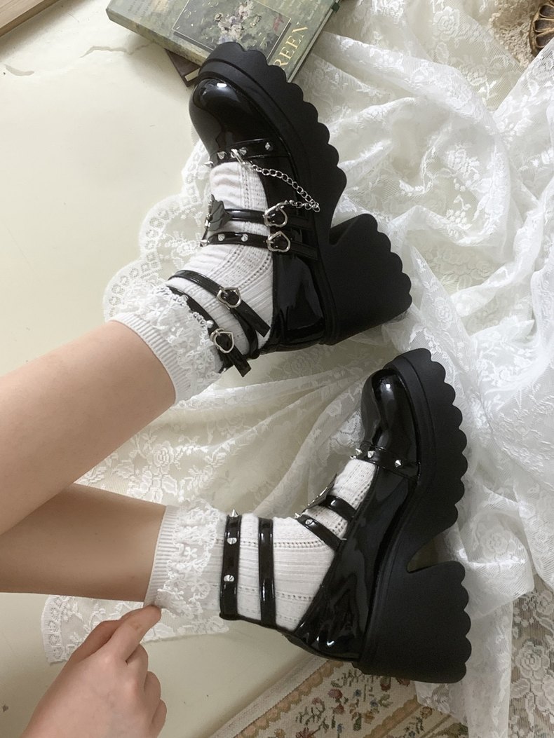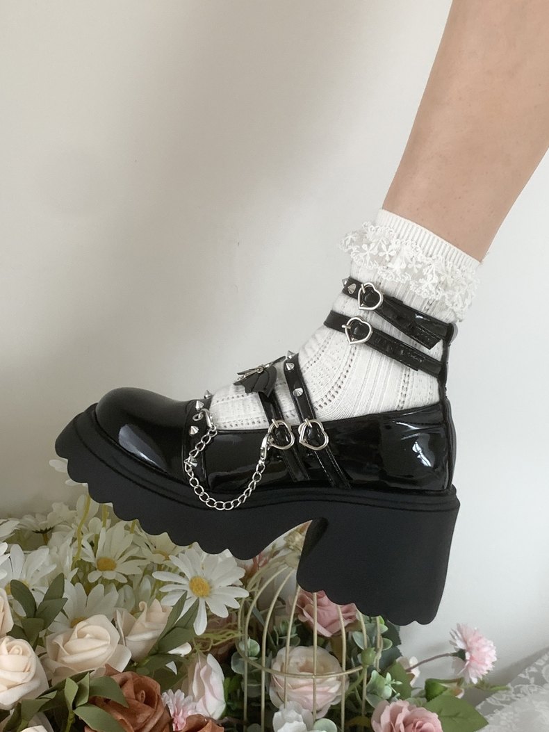 Unleash your inner rockstar with these edgy JK black leather heeled shoes! Featuring a chained accent and dramatic bat wing embellishments, these heels add a touch of gothic flair to any outfit. The smooth leather construction ensures comfort and style, perfect for taking your JK look to the next level.