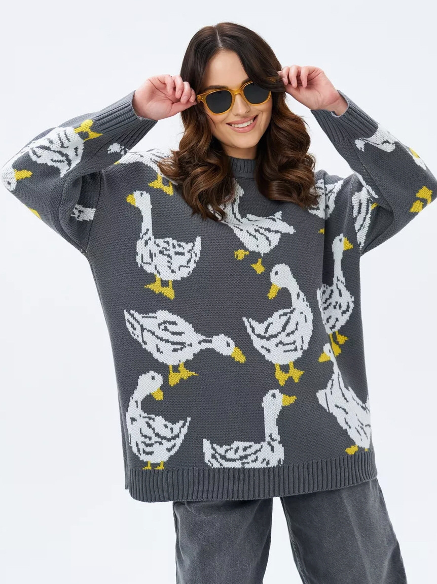 Embrace your inner duck enthusiast with this adorable and cozy knitted sweater. Featuring a charming duck pattern, this pullover is perfect for adding a playful touch to your wardrobe. The soft, high-quality knit material ensures warmth and comfort on chilly days. Whether you're heading out for a casual outing or relaxing at home, this sweater is a must-have for any duck lover.