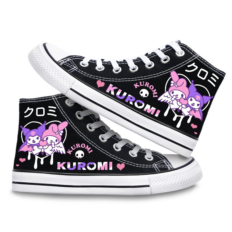 Step into a world of cute and edgy style with our Kuromi Melody Print High Top Sneakers. Made from durable canvas material, these high-tops are a must-have for fans of Sanrio's mischievous duo. Featuring a vibrant, all-over print of Kuromi and My Melody, these sneakers add a playful pop to any outfit. They're comfortable for all-day wear and perfect for showing off your unique style.